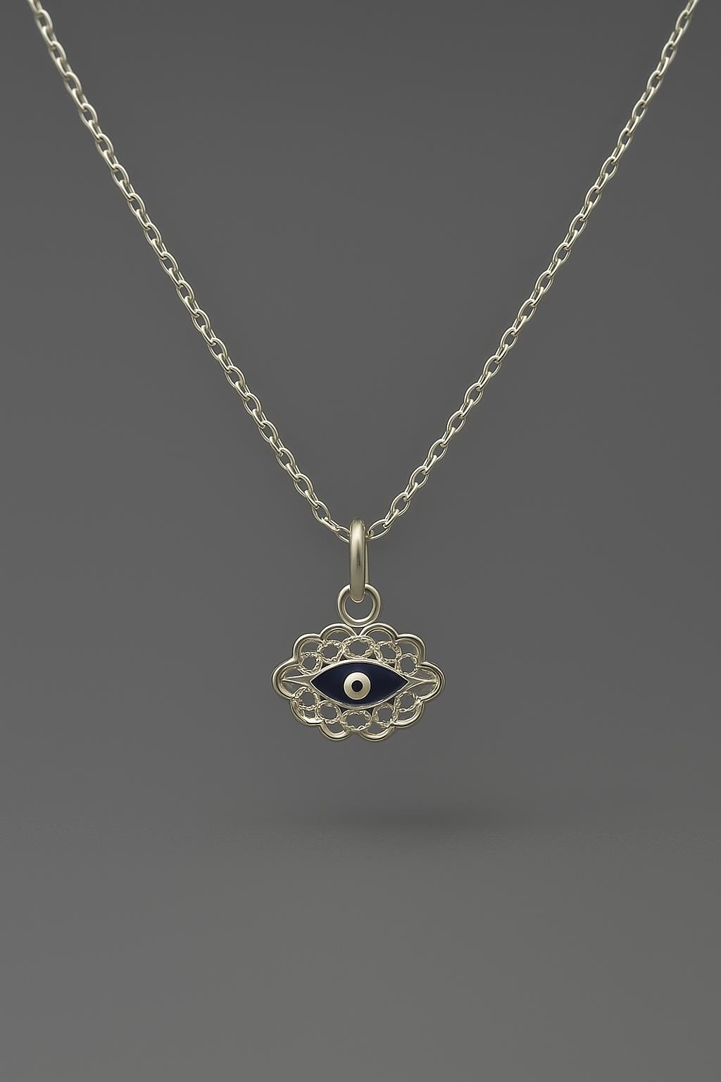 Ürün Hakkında: Göz nazar boncuklu gümüş kolye ucu. Üzerindeki gümüş zincir dâhildir;