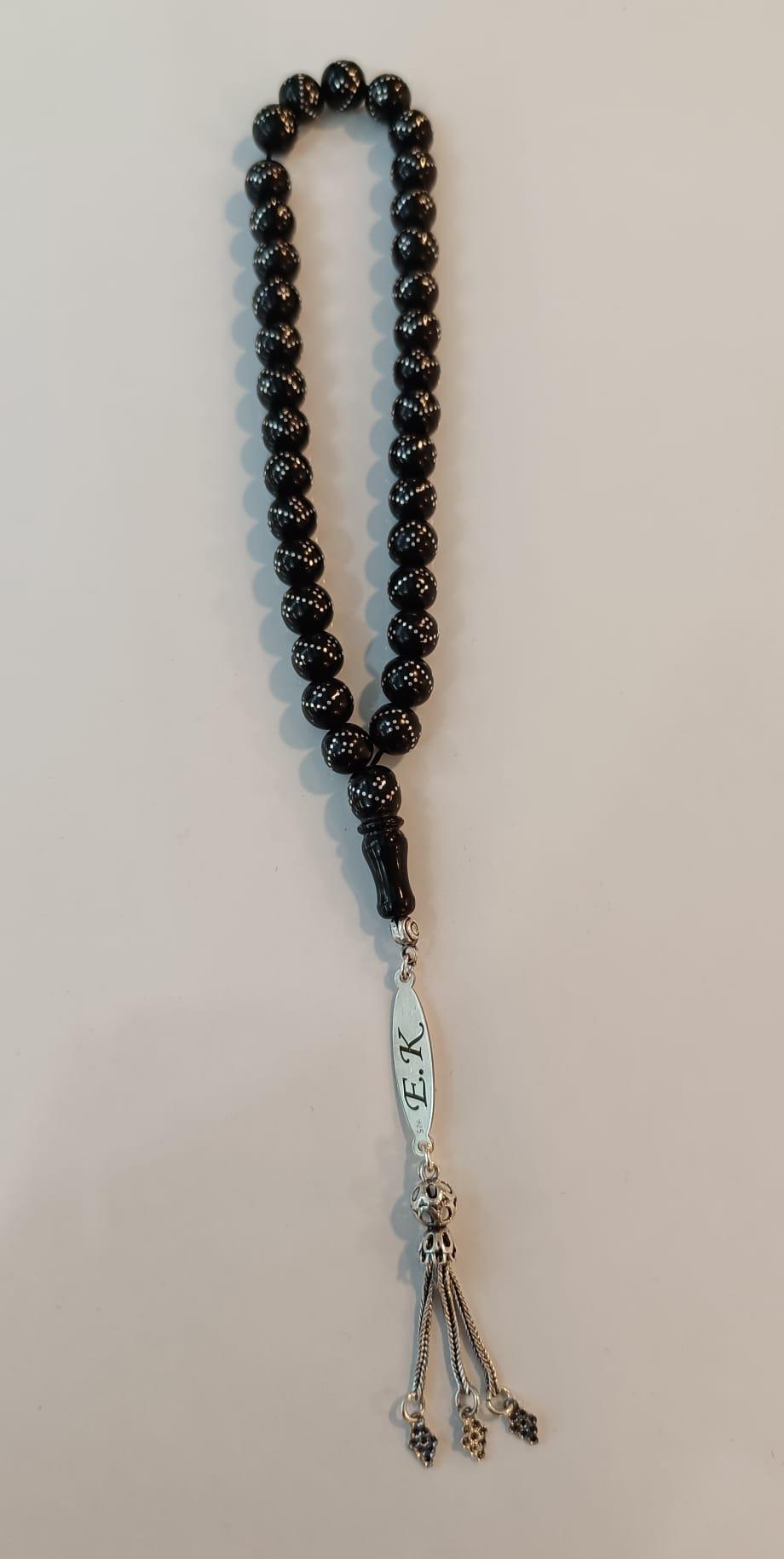 Ürün Hakkında: Gümüş işlemeli Rus Oltu taşı tesbih. Gümüş plaka üzerine kişiye özel arkalı önlü Ad Soyadı yazılabilen 925 ayar gümüş işlemeli tesbih;